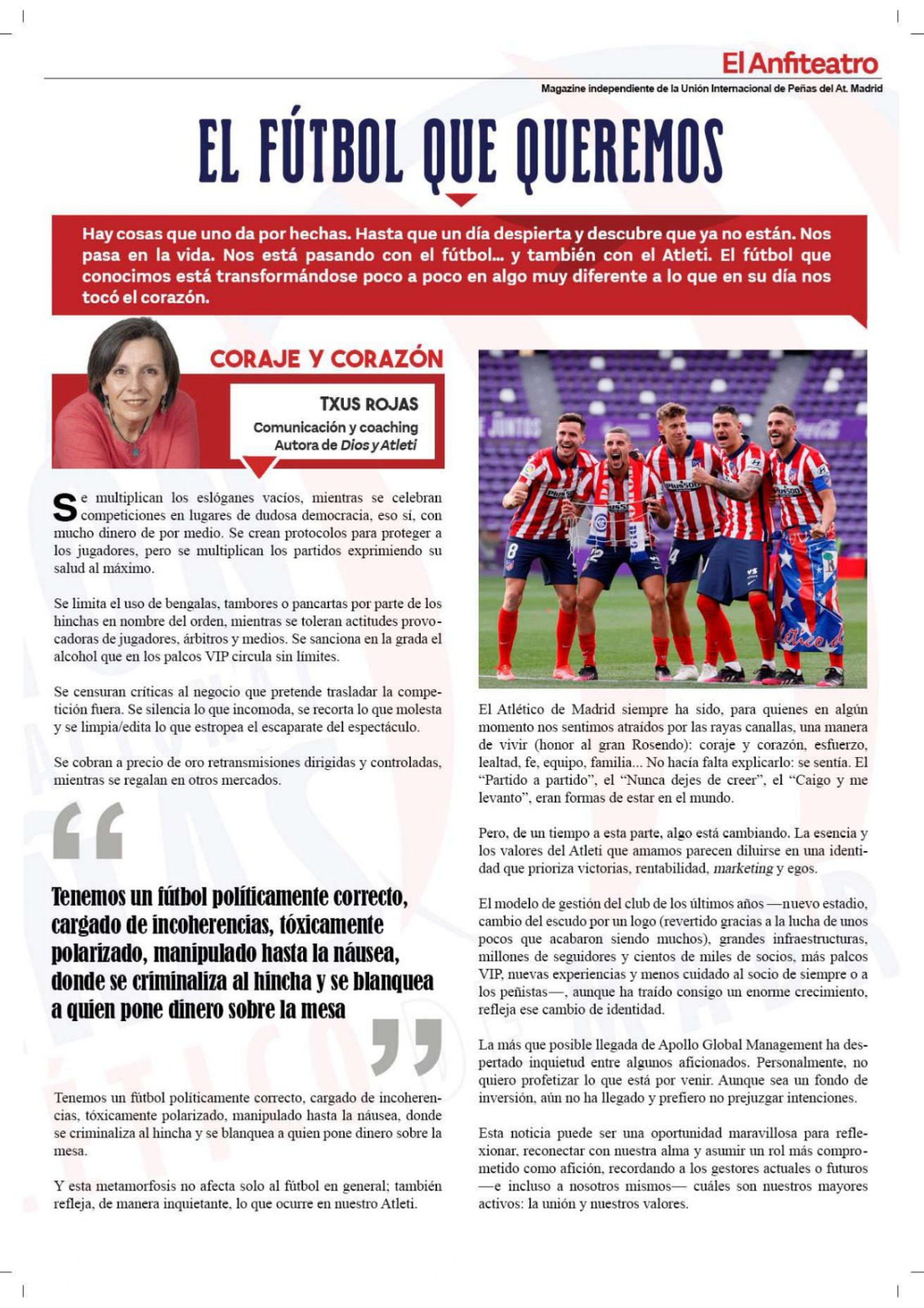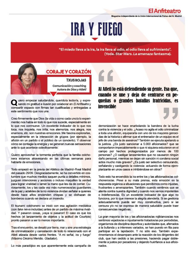 • Artículo “El fútbol que queremos”, revista “El Anfiteatro” (Unión Internacional de Peñas del Atlético de Madrid). Octubre 2025