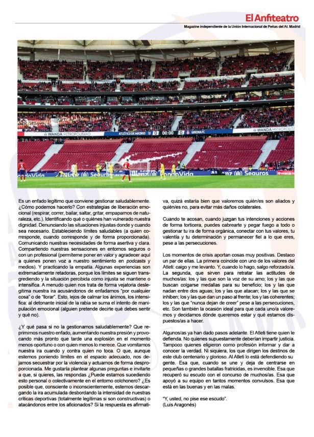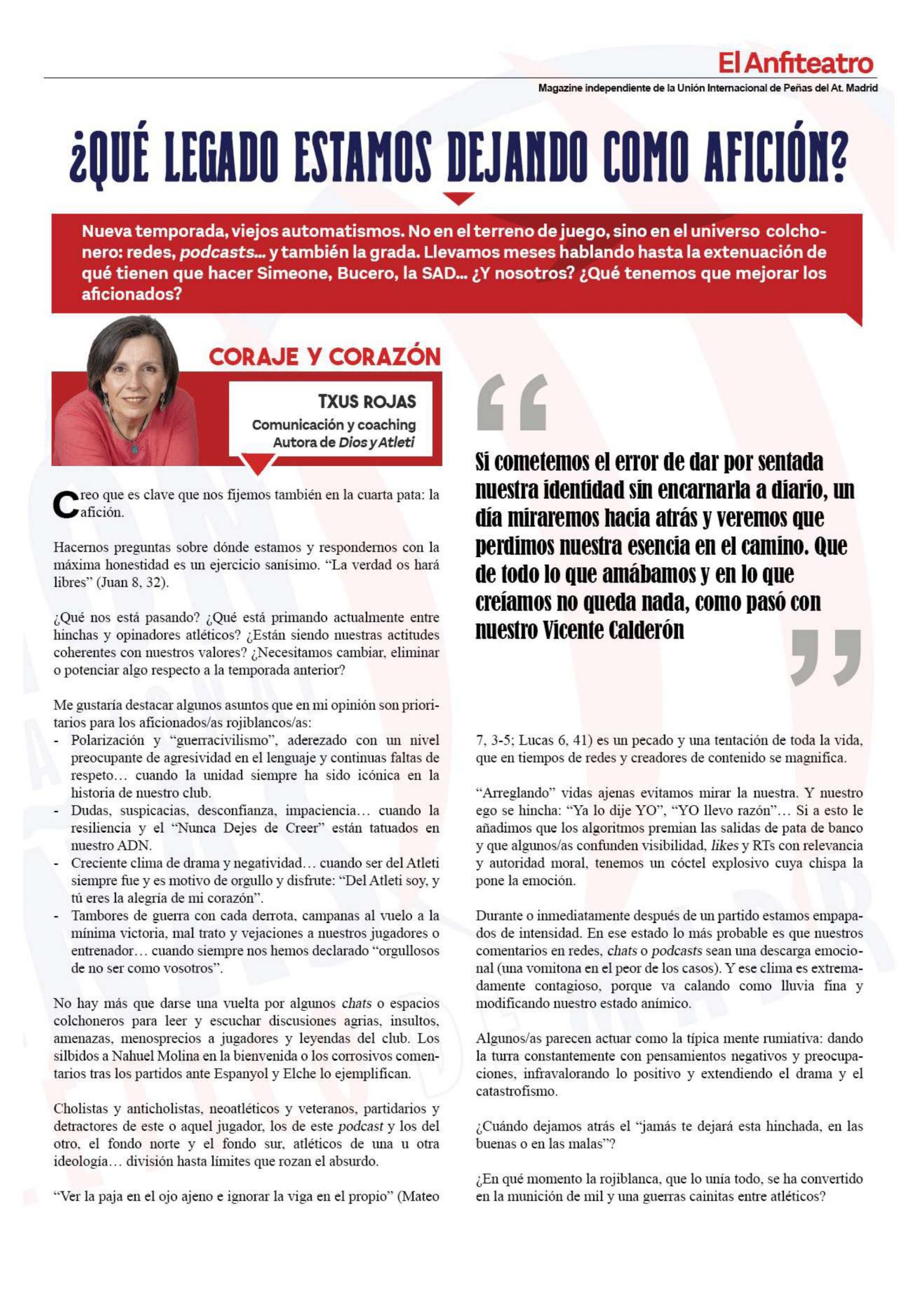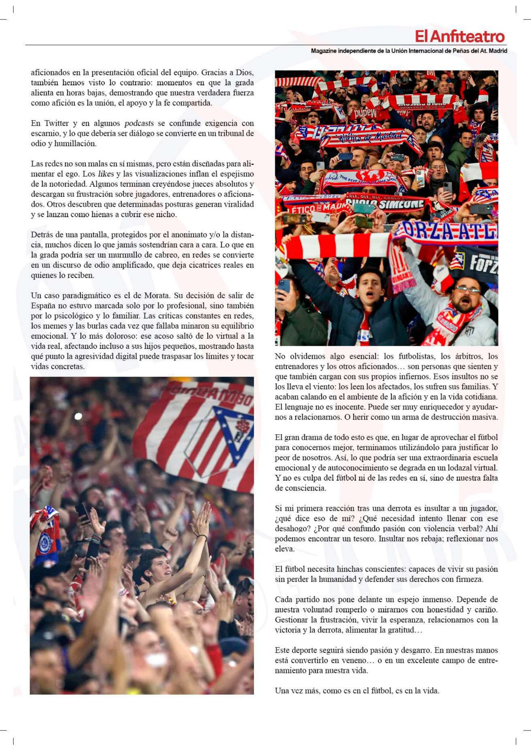 • Artículo “¿Qué legado estamos dejando como afición?”, revista “El Anfiteatro” (Unión Internacional de Peñas del Atlético de Madrid). Agosto 2025