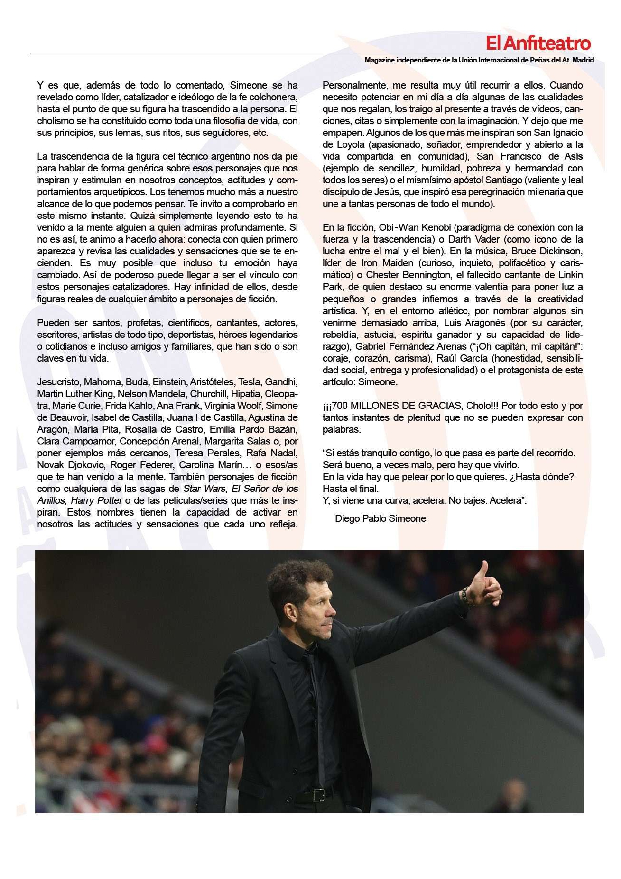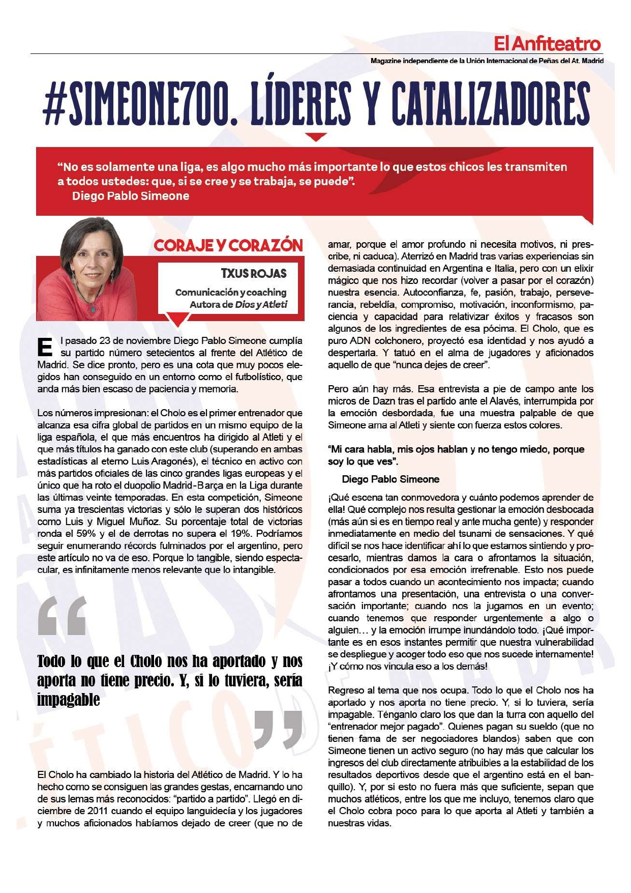• Artículo “#Simeone700. Líderes y catalizadores”, revista “El Anfiteatro” (Unión Internacional de Peñas del Atlético de Madrid), Noviembre 2024