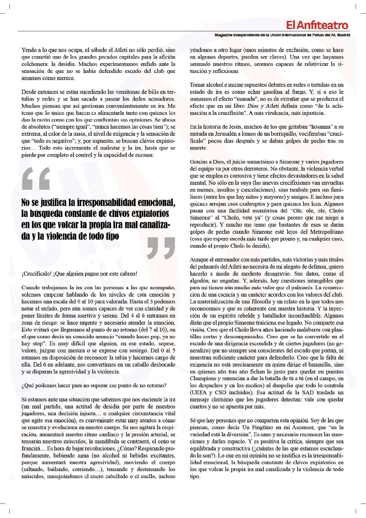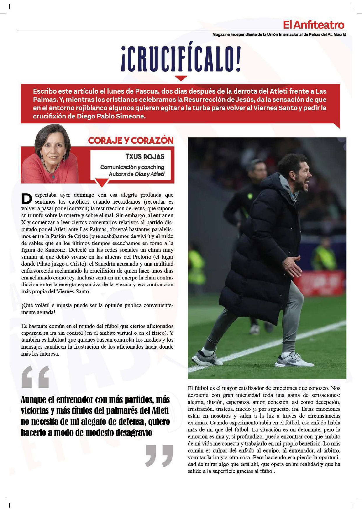 • Artículo “¡Crucifícalo!”, revista “El Anfiteatro” (Unión Internacional de Peñas del Atlético de Madrid). Abril 2025