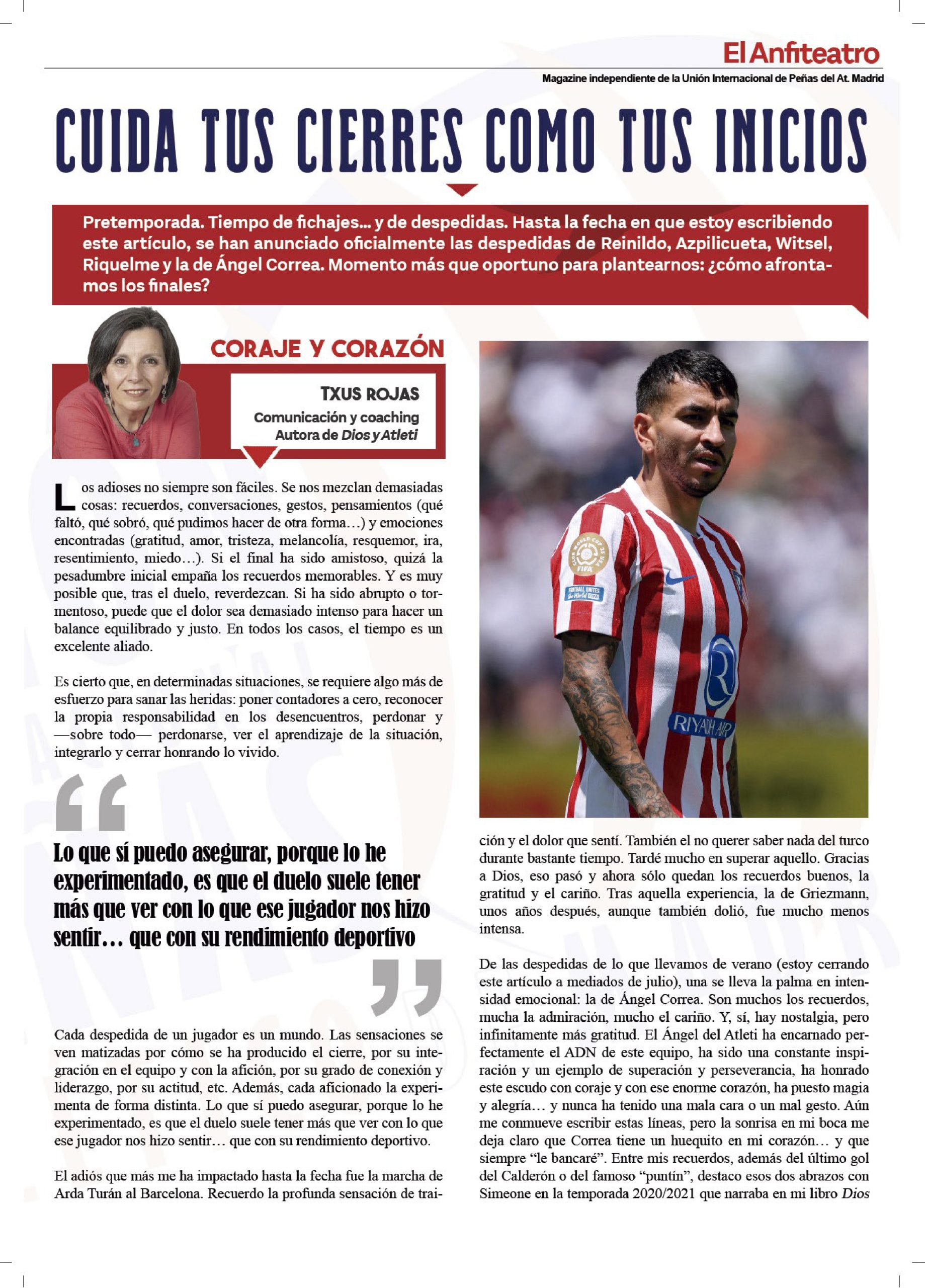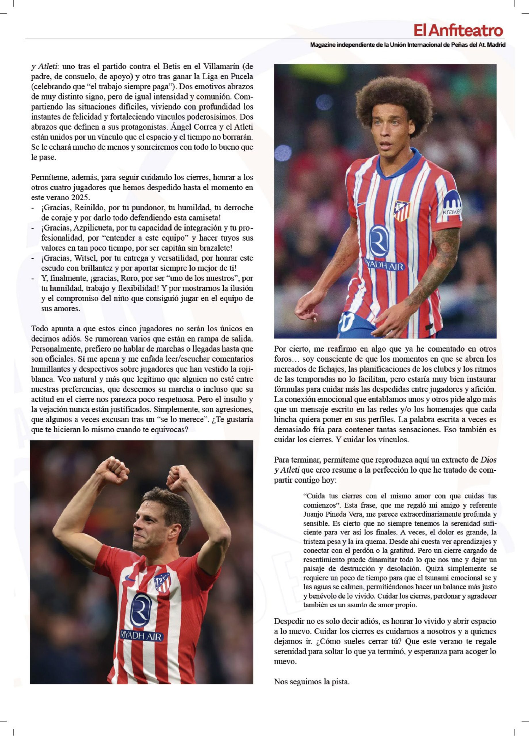 • Artículo “Cuida tus cierres como tus inicios”, revista “El Anfiteatro” (Unión Internacional de Peñas del Atlético de Madrid). Julio 2025