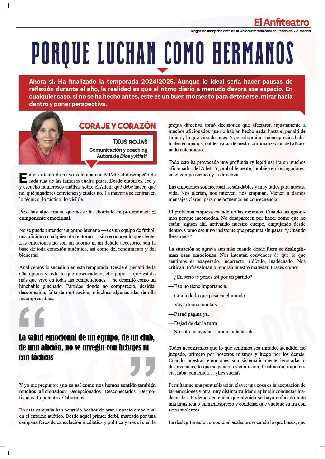 • Artículo “Porque Luchan Como Hermanos”, revista “El Anfiteatro” (Unión Internacional de Peñas del Atlético de Madrid). Junio 2025